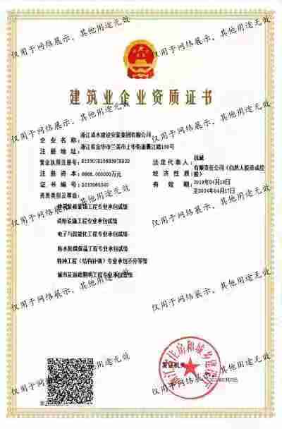 浙江清水建設安裝集團有限公司成立于2013年,注冊資金6688萬元。集團具有消防設施工程專業承包壹級、城市與道路照明專業承包壹級、電子與智能化專業承包壹級、建筑裝飾裝修專業承包貳級、防水防腐保溫專業承包貳級、市政工程施工總承包貳級、機電工程施工總承包貳級、建筑工程施工總承包貳級、電力工程施工總承包貳級、機電工程專業承包貳級、環保工程專業承包貳級、古建筑工程專業承包貳級、特種工程結構補強專業承包、建筑施工勞務作業專業承包(憑建筑業企業資質證書經營